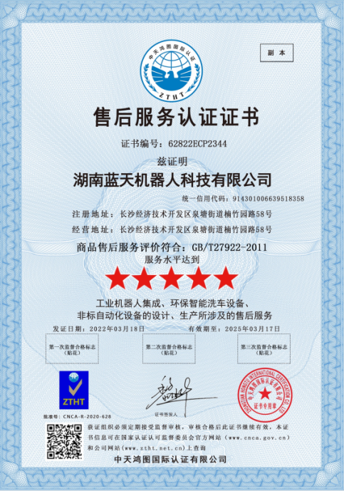 實(shí)力“五星”, 服務(wù)“五星”!湖南藍(lán)天機(jī)器人通過商品售后服務(wù)評(píng)價(jià)體系五星級(jí)認(rèn)證