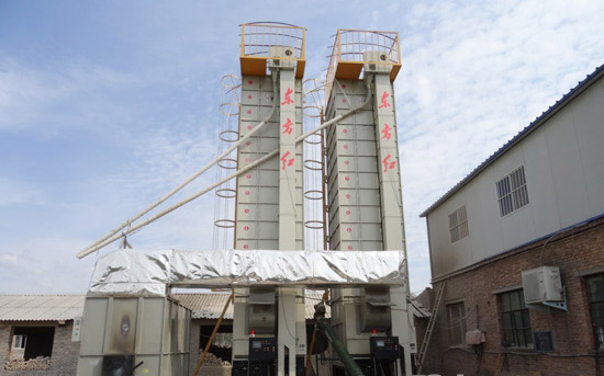 2臺東方紅5H-15循環(huán)式糧食烘干機正在進行烘干作業(yè)